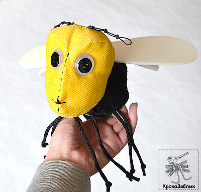 Для путешествий сшита Пчёлка. Крупненькая такая, упитанная =) Из микровельвета и искусственного меха. Внутри синтепон. Лапки и усики — шнурочки, крылья из плотной пенки (это такой сумочный уплотнитель, откуда-то давно у меня лежал), глазки — пуговки.