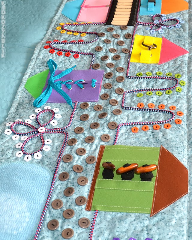 Дорожка массажная, 200х40 см. Вдоль дорожки из пуговиц и деревянных мостиков расположились десять домиков с разными застежками.